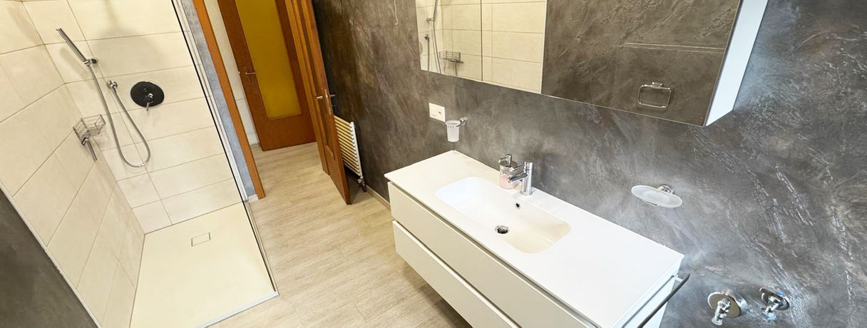 - Bagno elegante con doccia walk-in, pratico e raffinato